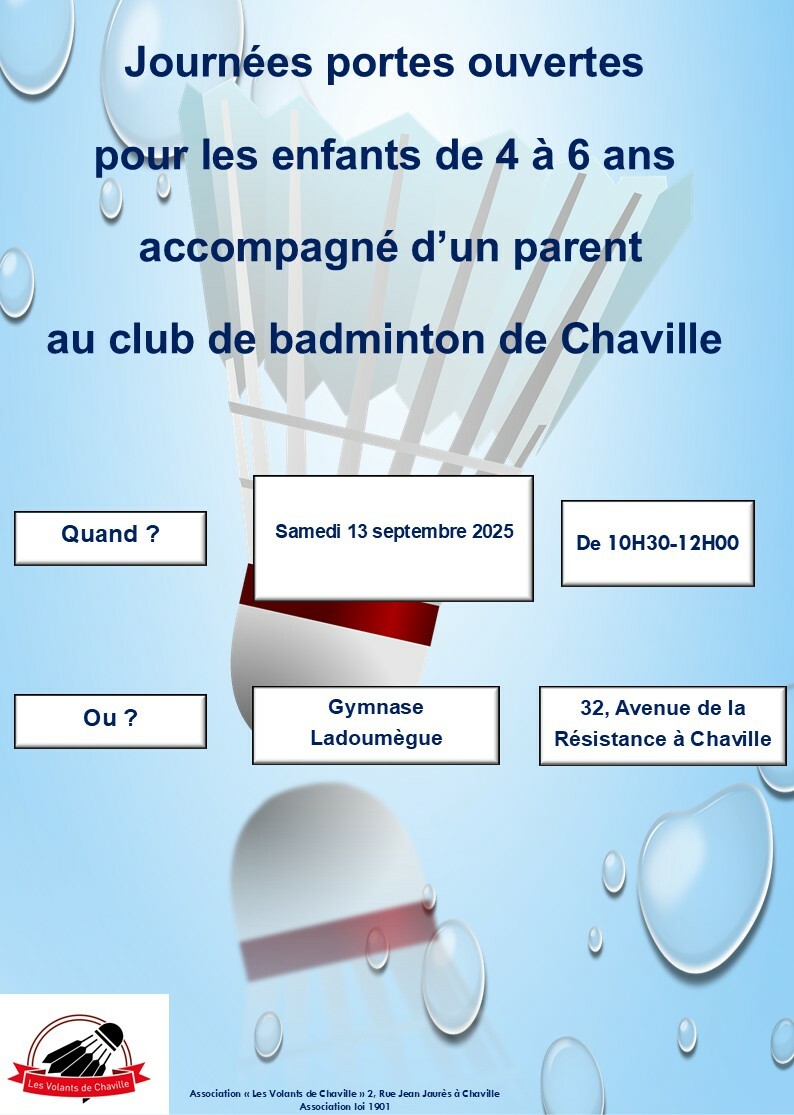 Porte Ouverte Mini Badminton Samedi 13 Septembre 2025 de 10H30-12H00 - Enfant de 4 à 6 ans